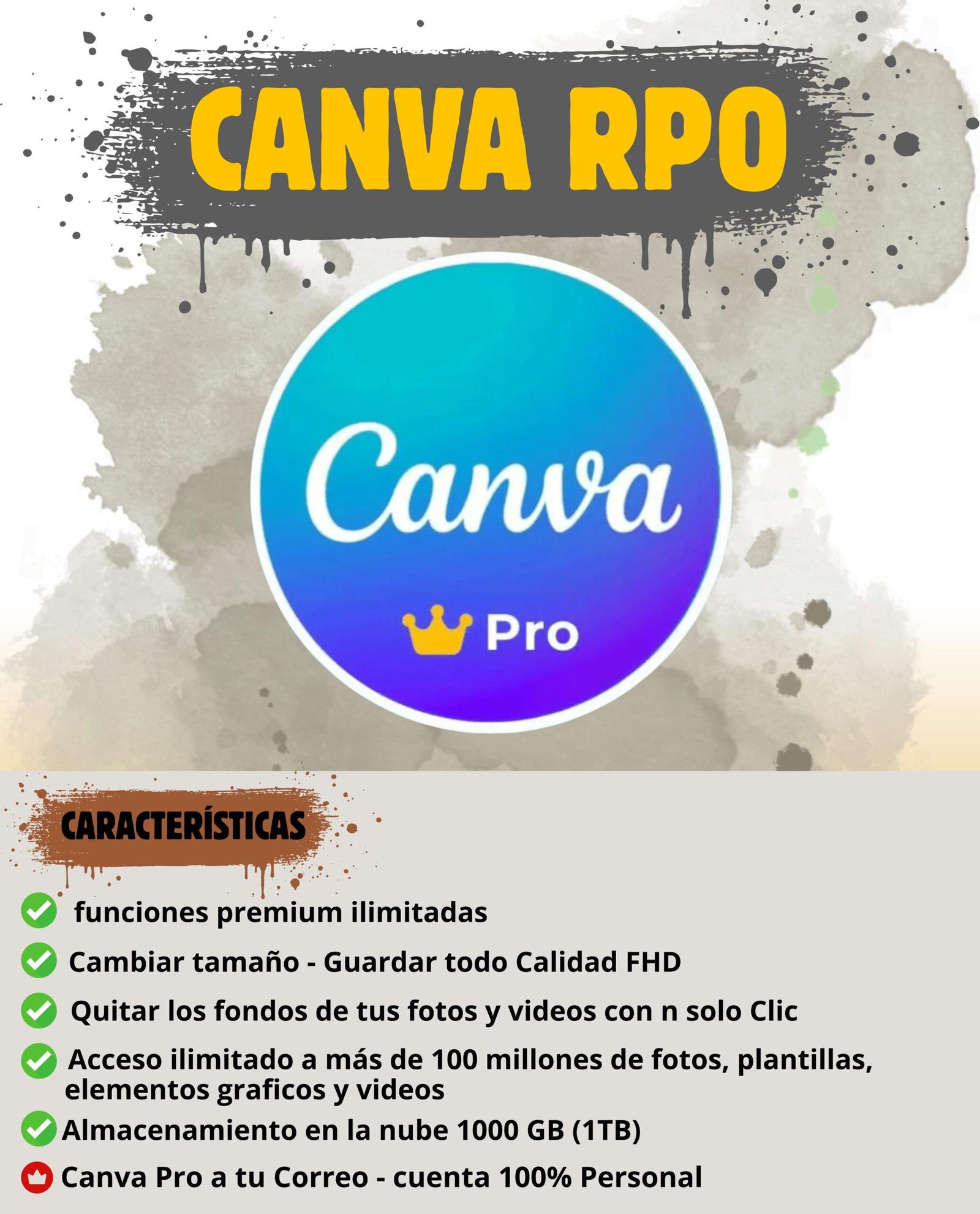 Acceso completo a todas las funciones premium de Canva Pro: millones de recursos, plantillas exclusivas, herramientas avanzadas de edición, eliminación de fondos y colaboración en equipo sin límites.